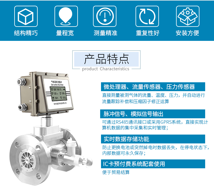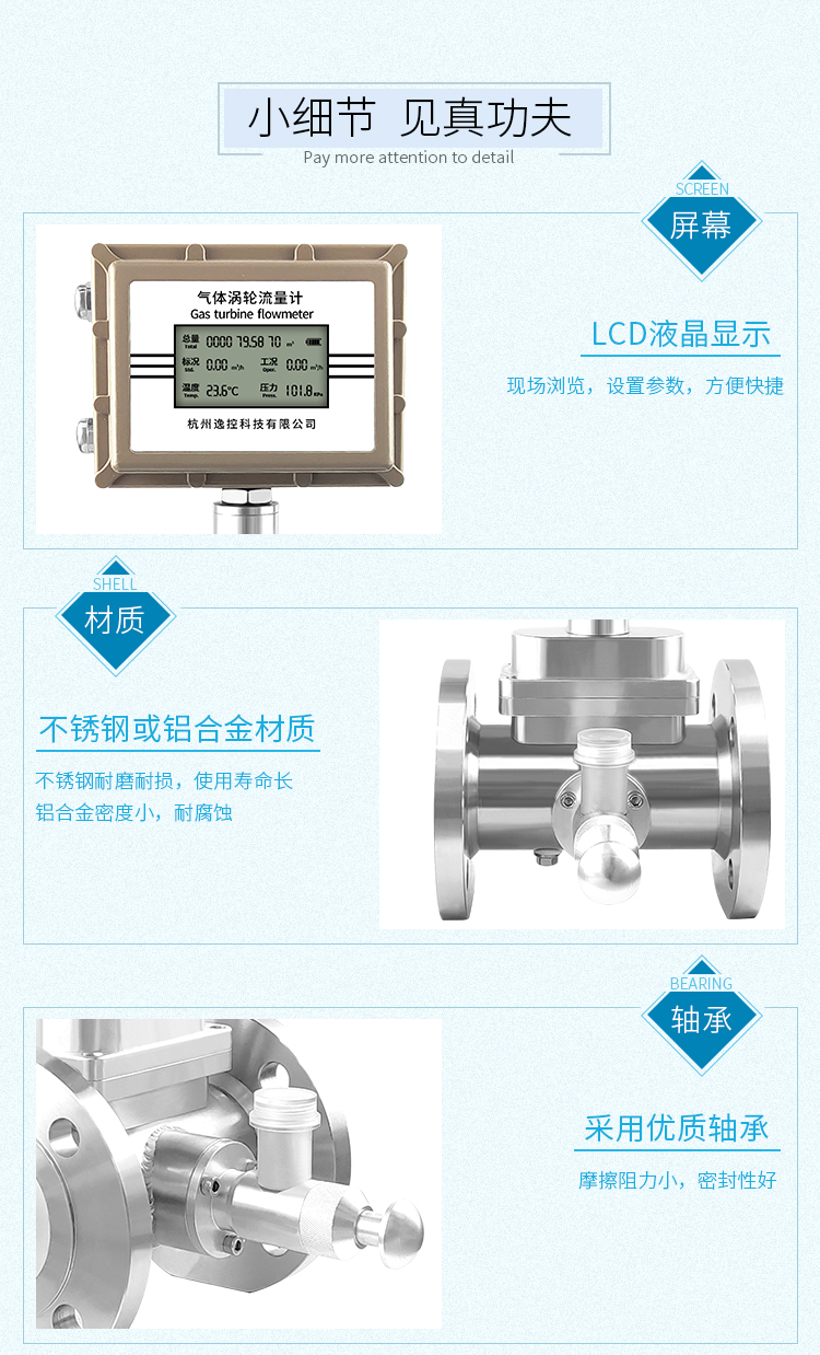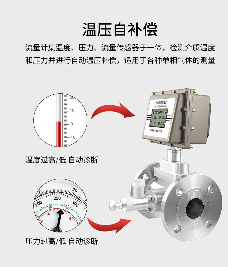 溫壓補償型氣體渦輪流量計集氣體渦輪流量傳感器與流量轉(zhuǎn)換器于一體,在流體的作用下,渦輪克服阻力矩和磨擦力矩開始轉(zhuǎn)動。當(dāng)力矩達到平衡時,轉(zhuǎn)速穩(wěn)定,渦輪的轉(zhuǎn)速與氣體流量成正比, 并通過旋轉(zhuǎn)的發(fā)訊盤上的磁體周期性地改變磁場,從而使脈沖發(fā)生器輸出頻率與流速成正比的脈沖信號。