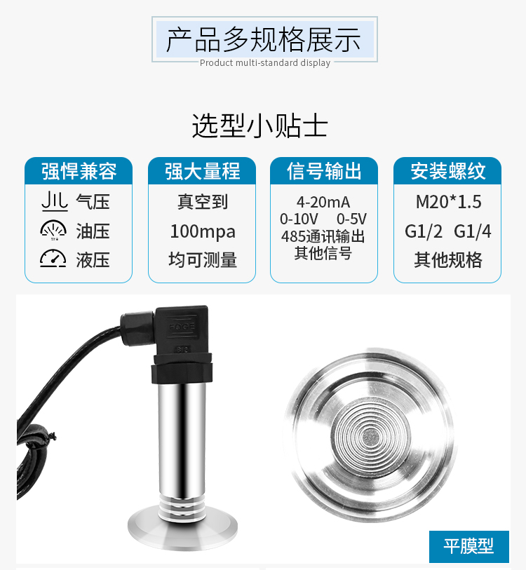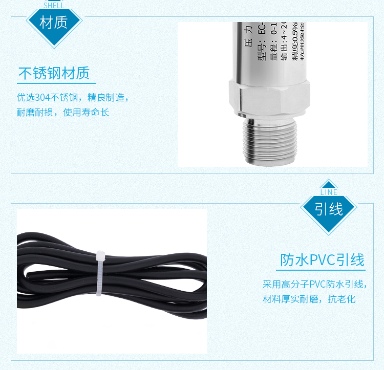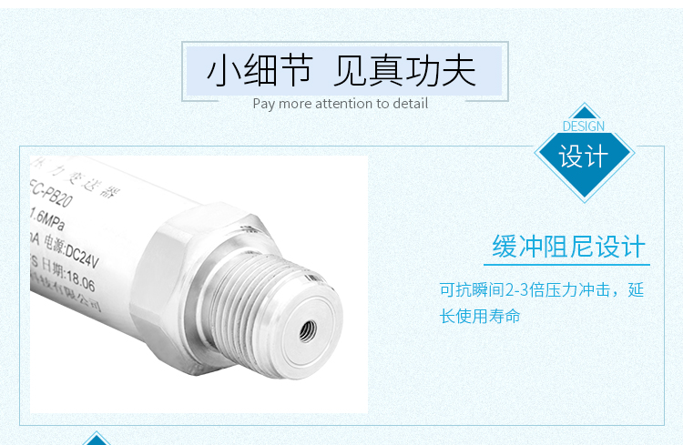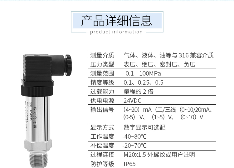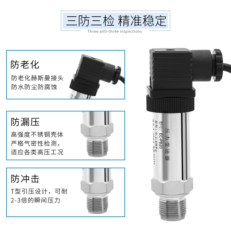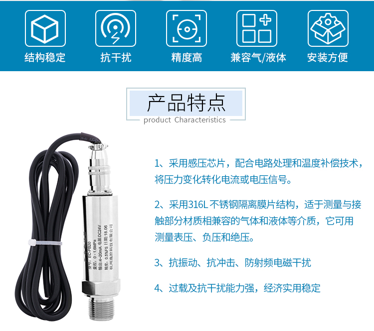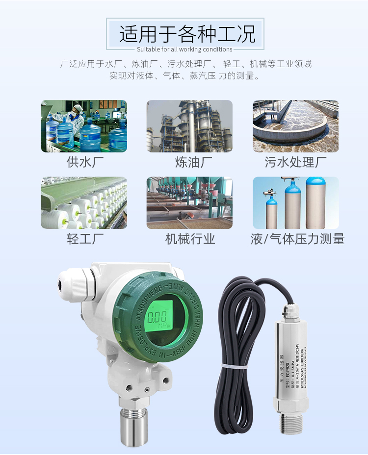 壓力變送器壓力敏感核心采用了高性能的硅壓阻式壓力充油芯體,內(nèi)部的專用集成電路將傳感器毫伏信號轉(zhuǎn)換成標準電壓、電流或頻率信號,可以直接與計算機接口卡、控制儀表、智能儀表或PLC等方便相連。運距離傳輸可以采用電流輸出方式。
