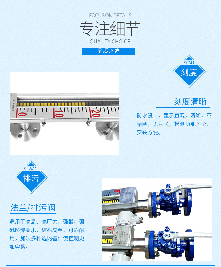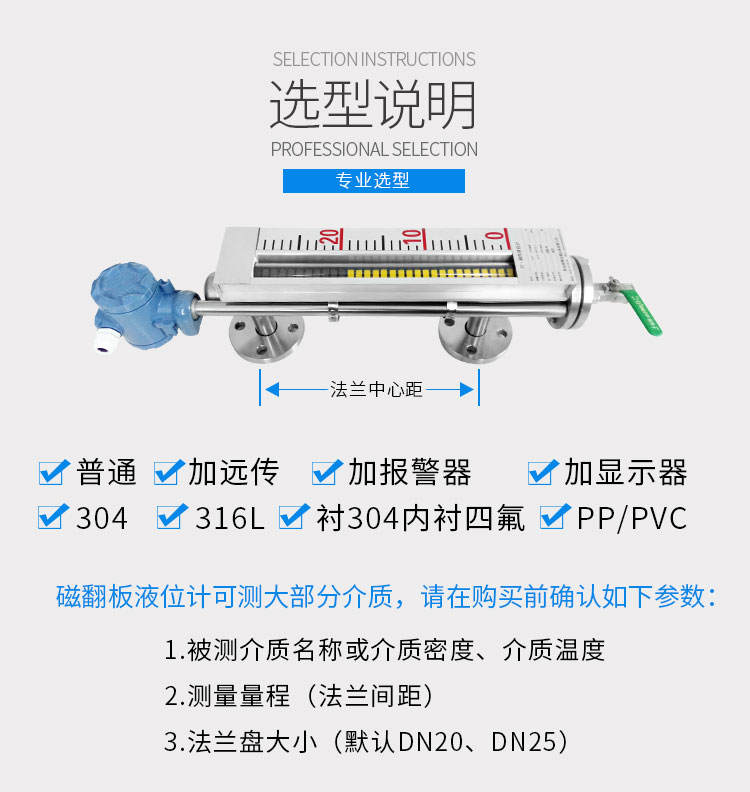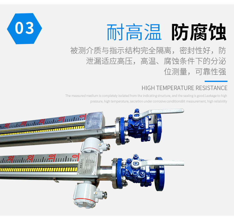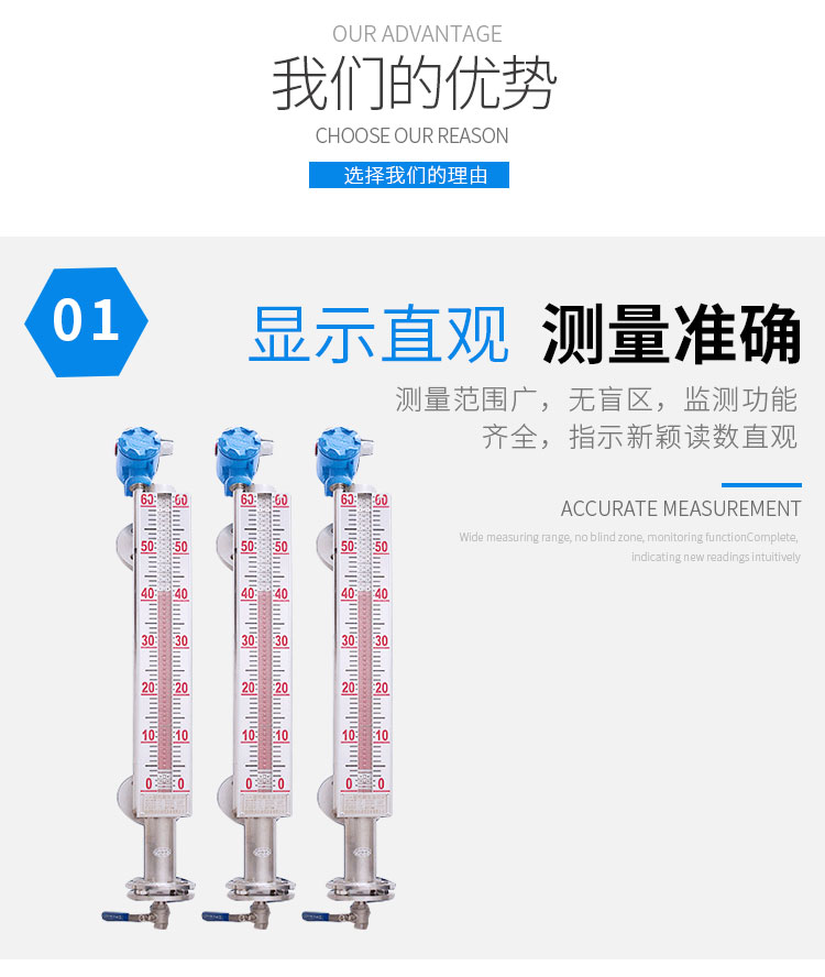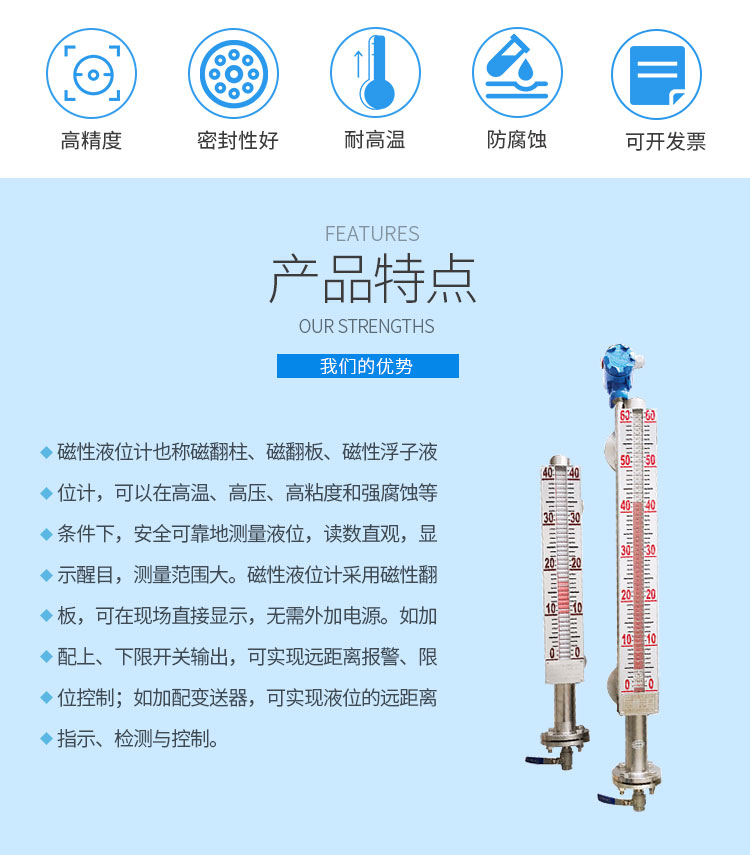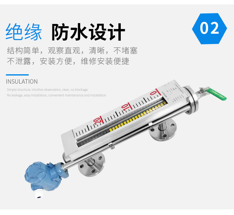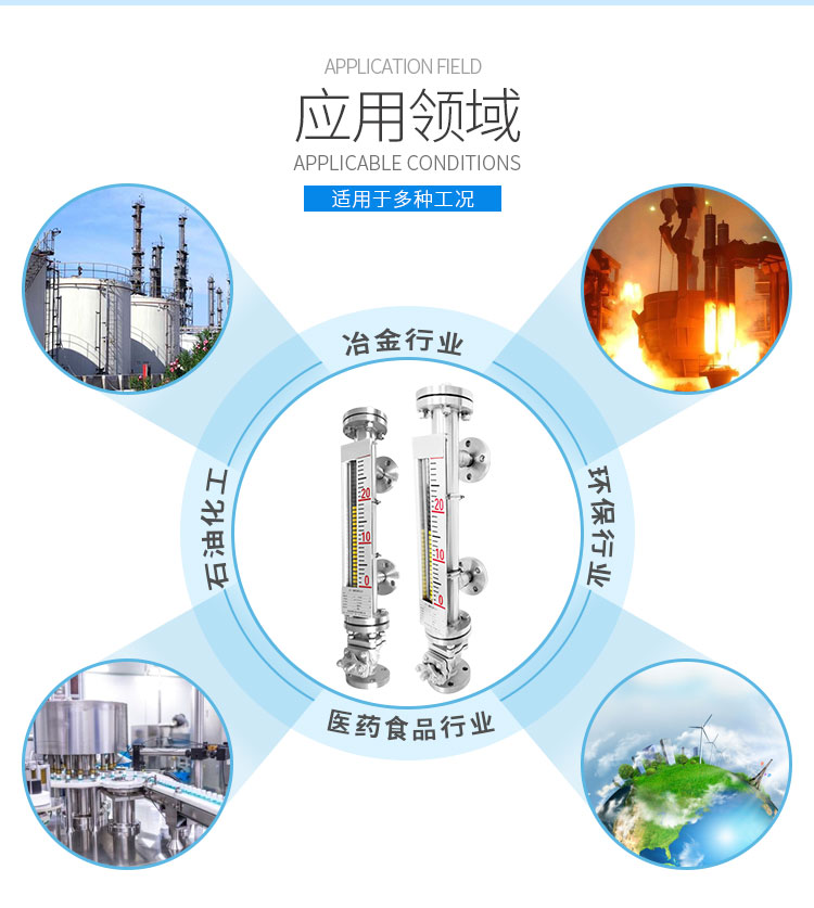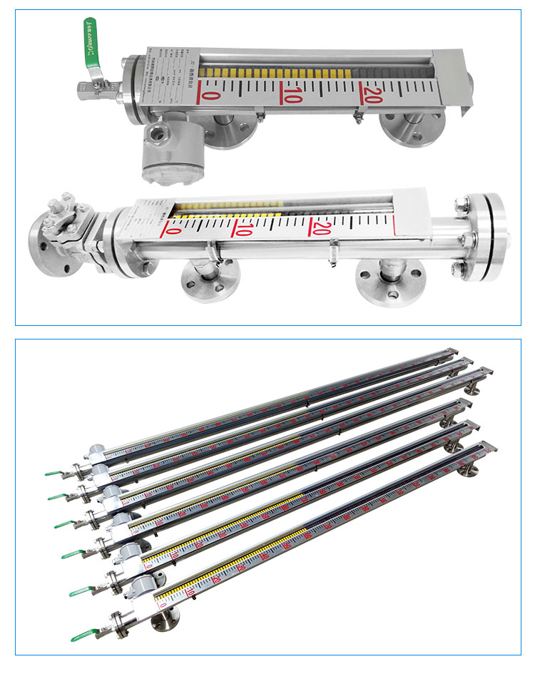 磁性液位計(jì)也稱磁翻柱、磁翻板、磁性浮子液位計(jì),可以在高溫、高壓、高粘度和強(qiáng)腐蝕等條件下,安全可靠地測(cè)量液位,讀數(shù)直觀,顯示醒目,測(cè)量范圍大。該系列產(chǎn)品廣泛用于電力、石油、化工、冶金、環(huán)保、醫(yī)藥、食品等各行業(yè)過(guò)程中的液位測(cè)量和控制。 磁性液位計(jì)采用磁性翻板,可在現(xiàn)場(chǎng)直接顯示,無(wú)需外加電源。如加配上、下限開(kāi)關(guān)輸出,可實(shí)現(xiàn)遠(yuǎn)距離報(bào)警、限位控制;如加配變送器,可實(shí)現(xiàn)液位的遠(yuǎn)距離指示、檢測(cè)與控制。